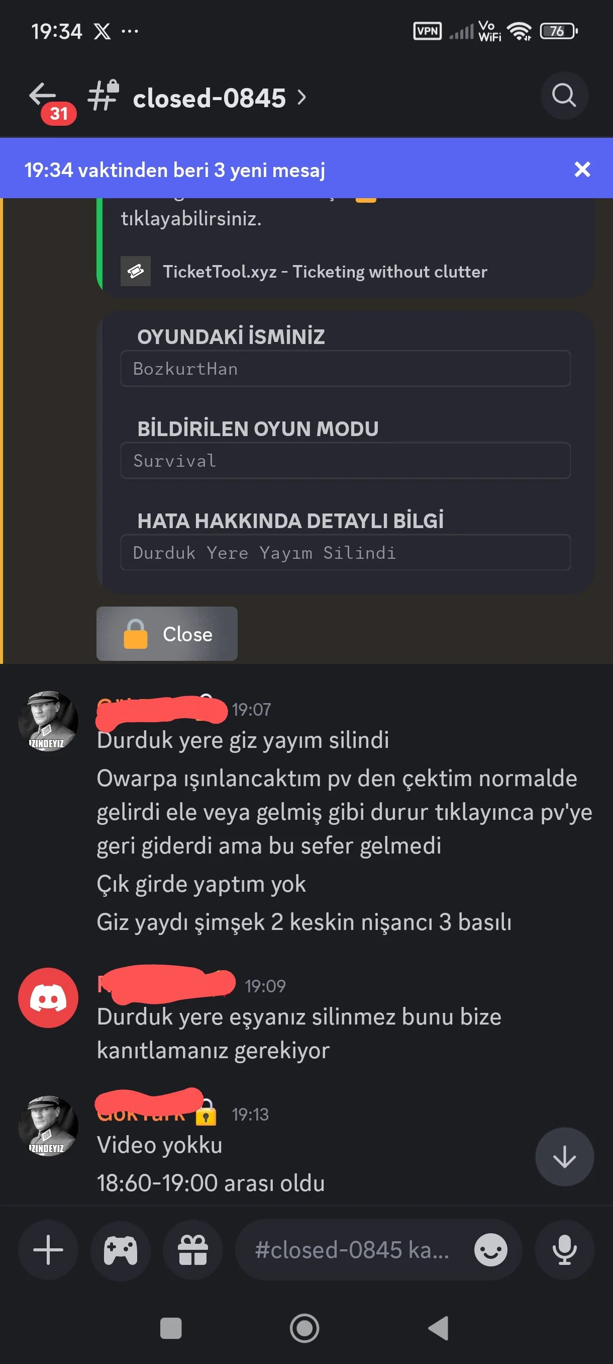 3-5 ay gibi uzun bir süredir minecraft knightnw.com sunucusu üzerinde survival oynamaktayım sunucuda kurallar ve destek sistemi o kadar kötü ve rezalet bir durumdaki oyuncular claiminize raid atsa emekleriniz geri verilmiyor ve oyuncu sadece 2 gün jail yiyor oyuncu sizi claiminizin yanında claim alıp trapa sokarsa oyuncu sizi kestikten sonra işlem uygulanıyor ve sadece suçu işlediği hesaba işliyor bu yan hesaplarına işlemiyor ve giden eşyalarınız verilmiyor oyuncu sizlerin emeklerinizi maaf edip sizleri keserek itemlerinizi aldıktan sonra sizin ticket açmanız üzerine tickete geri dönüş sağlanıp yetkililerin oyuna giripte cezayı işlemesi sonrası oyuncuya anca ceza uygulanıyor bu süreç içerisinde oyuncu eşyaları yan hesabına gecirip emeklerinizi daha'da maaf edebiliyor ticket harici işlem uygulanmadığından oyuncular oyun içerisinde yetkililerin uyarılarına dahi kulak asmamaksızın emeklerinizi hiçe çıkarabiliyor ve bu süreçte siz oyuncuya karşılık verirseniz sizde rahatsız etmeye gelen oyuncuyu rahatsız etmekten ceza yiyorsunuz hile sistemi ise siz hile olmamanıza rağmen sizi savaş esnasında oyundan atarak yine eşyalarınızı hiçe çıkarabiliyor emeklerinizi götürebiliyor ve eşyaları alabilmek daha doğrusu bu sunucusa hayatta kalabilmek için MOBESE gibi 7/24 kayıt almanız gerekiyor yetkililer eringenliklerinden uğraşmamak için loglara bakmıyor ve size bakamayız diyip geçiştirerek olayı ört pas ediyor pay to win dahi olsanız toksic kitle tarafından emekleriniz hiçe çıkarılarak zarar üstüne zarar ediyorsunuz yetkililer sizlerden kanıt istiyor ama kanıtı kendileri sunmaya gelince sunmuyor