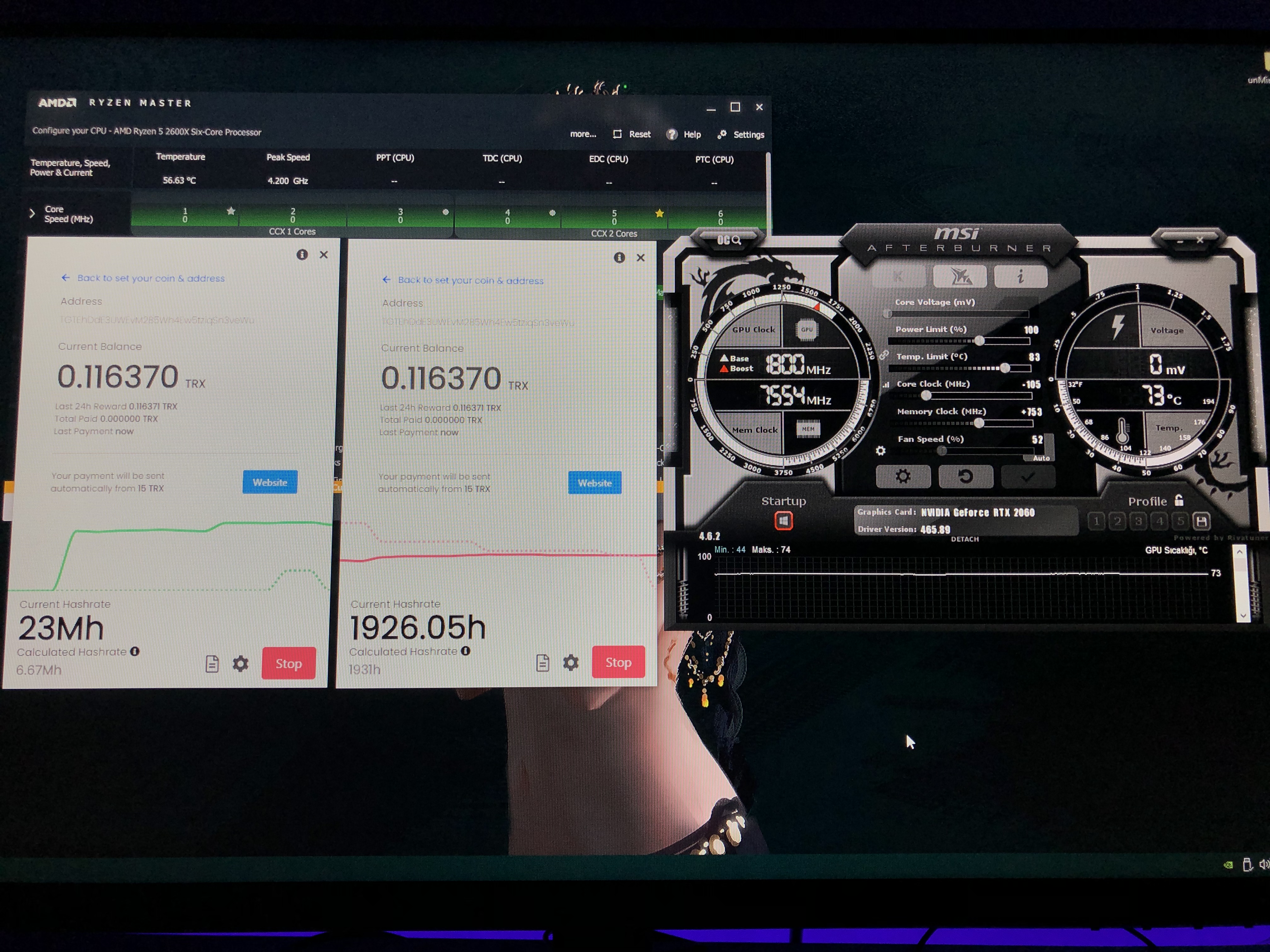 Enes Tutar yazmış: Ekran kartı sıcaklığı bana fazla geldi uzun sürede belki macun sorun çıkarabilir. Devamı için tıklayın... Johnny Depp yazmış: Power Limit düşürsene o sıcaklık ney? Sıcaklık oysa VRM'lerin sıcaklığını düşünemiyorum bile. Devamı için tıklayın... Laxerian yazmış: Power limit düşür mangal yapmıyoruz burada :d Devamı için tıklayın... Power limit kaç yapayım? Core Clock -105 Memory Clock +890’da şu anda 26.2MH ile kazım yapıyor. Kart 68 / 69 derece, fan açtım az biraz daha. Post automatically merged: 2 Mayıs 2021 Durum böyle