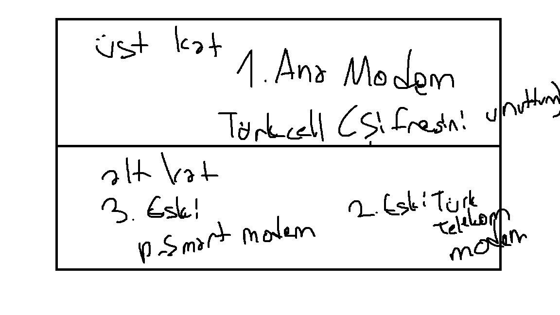 Arkadaşlar, öncelikle merhaba. Şuan Superonline modem ve internetini kullanmaktayım. Ama web arayüz şifresini unuttum. Sıkıntı bu değil reset atarak düzeltebilirim ama ev dubleks. Her yerden internet çekmiyor. Eski kullanmadığımız Türk Telekom ve D-Smart modemleri çoğaltıcı olarak kullanıyoruz. Yani evin uzak noktalarına eski modemlerle destek çıkıyoruz. Ben eğer reset atarsam bu düzen bozulur mu? Kafanızda canlanması için ufak çaplı bir çizim yaptım.