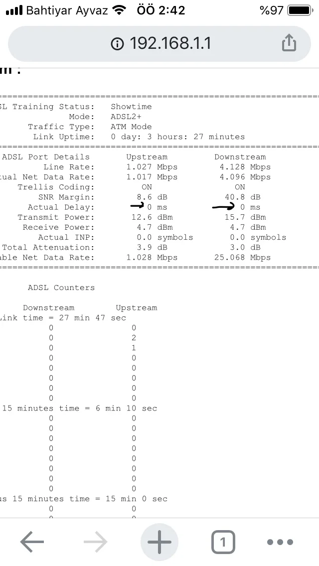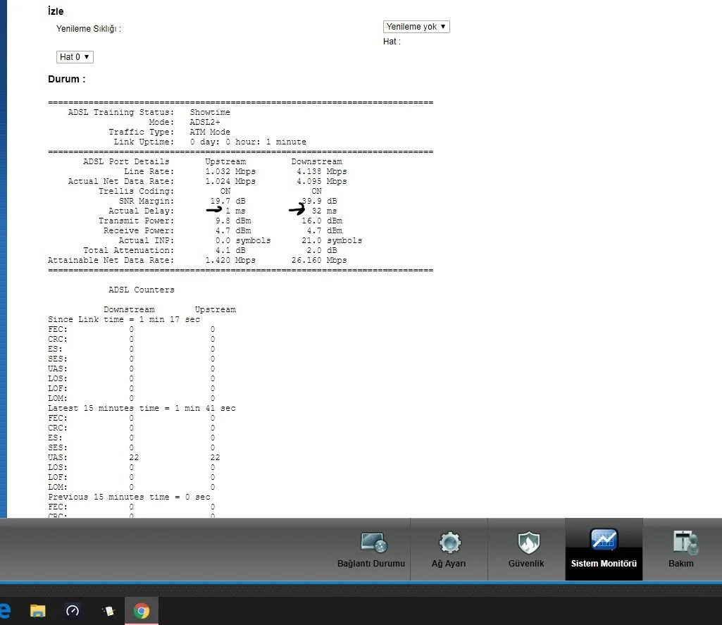 Beyler internetimde sıkıntı vardı gitti gitmeden önce pingim 26-27ms arasıydı modem istatisliklerindede actuel delay 0ms internet geldikten sonra pingim 60-61ms sorunun modem istatistiklerinden actuel delayın 32ms olduğunu düşünüyorum aramadığım yer kalmadı internette çözümüde yok nasıl bir yol zilemeliyim @Mehmet Yılmaz bir çözüm bulalım..