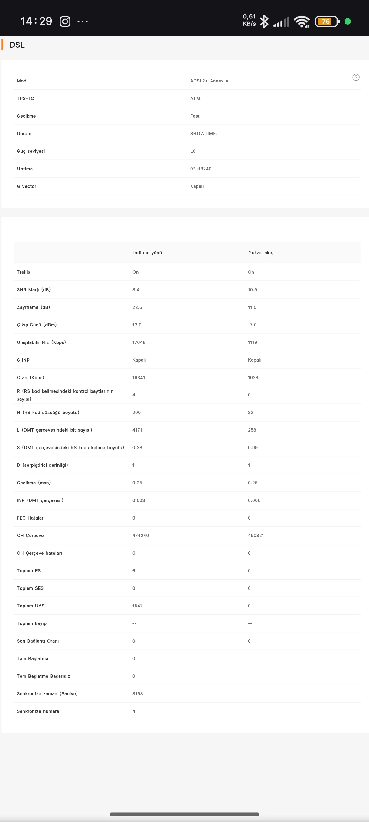 SNR Margine değerin 8.3 download için, bu değer sınır demek, sorun olmaması için 10 dB olmasında fayda var. Kablolarını kontrol edebilirsin veya modem kurulumu yapabiliyorsan modem kurulumunu yap. Bu değerin yükselmesi lazım. Saha dolabına uzaksan hızını 12 mbpsye sabitlemek de bir çözüm