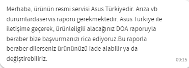 Trendyol üzerinden almıştım monitörü, gelir gelmez testlerini yaptığımda problemleri satıcıma yazdım ve bu mesajı aldım sonra trendyolu aradım onlarda bunu yapmam gerektiğini söyledi yani 14 gün tamamen yalan kutu açılmaması gerekiyormuş. Ekran kartımı temizlerken fanımın çatlak olduğunu gördüm ve garantiye göndermek istedim vatandan almıştım, vatana gittim verdim fatura garanti ne gerekiyorsa. Gitmesi ile gelmesi bir oldu, ekran kartının üstünde seri numarasının bir numarası silik olduğu için garanti dışı bıraktılar yani açıklamaları bu kadar.çok enteresan bir durum çünkü monitörü internetten aldıysanız DOA raporu değil 14 gün içinde kayıtsız şartsız iade edebilmeniz gerekiyordu. niye uğraştınız ki raporlarla. asus servis 1 yıl garantisi devam eden ekran kartınızı nasıl garanti dışı nasıl bıraktı çok merak ettim çünkü FSP türkiye ve Asus türkiye müşteri memnuniyeti konusunda aşşşırı iyiler bugüne kadar hiç yüzüst bırakmamışlardı beni. merak ettim doğrusu nasıl garanti dışı bıraktıklarını neye dayandırdılar?