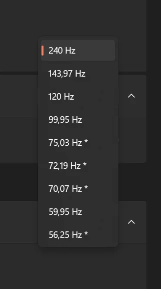 Sadece 144 Hz'de HDR açıkken 10 bit görünüyor. Hz seçenekleri de bunlar.Alıntıyı görüntüle