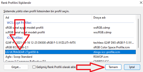 Ekle'ye tıklayın ve listeden ''LG ULTRAGEAR 27gn650-b''yi seçip Tamam'a basın.