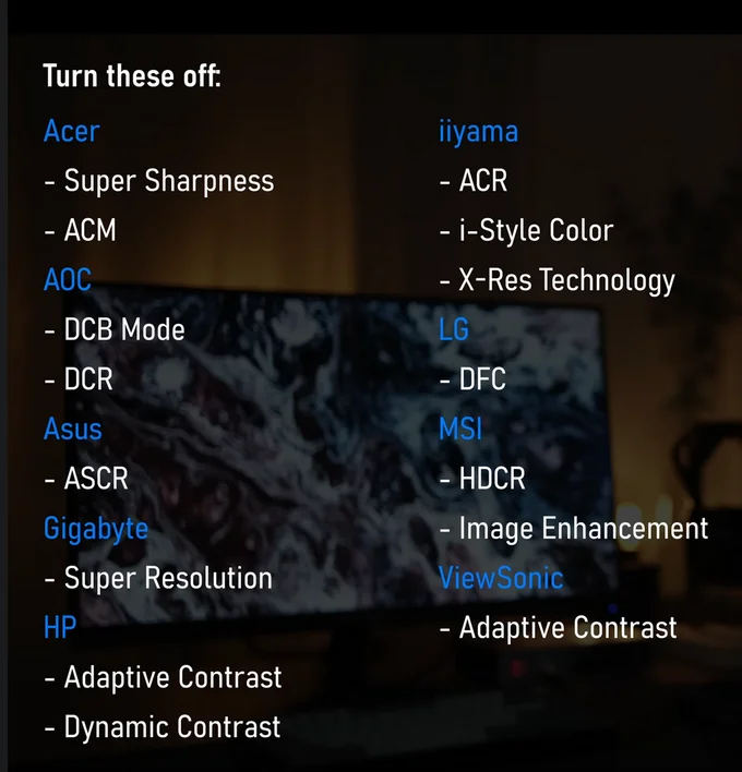 Monitörlerde bulunan genelde görüntü doğruluğunu bozan ayarların listesi (kapalı kalması önerilir)