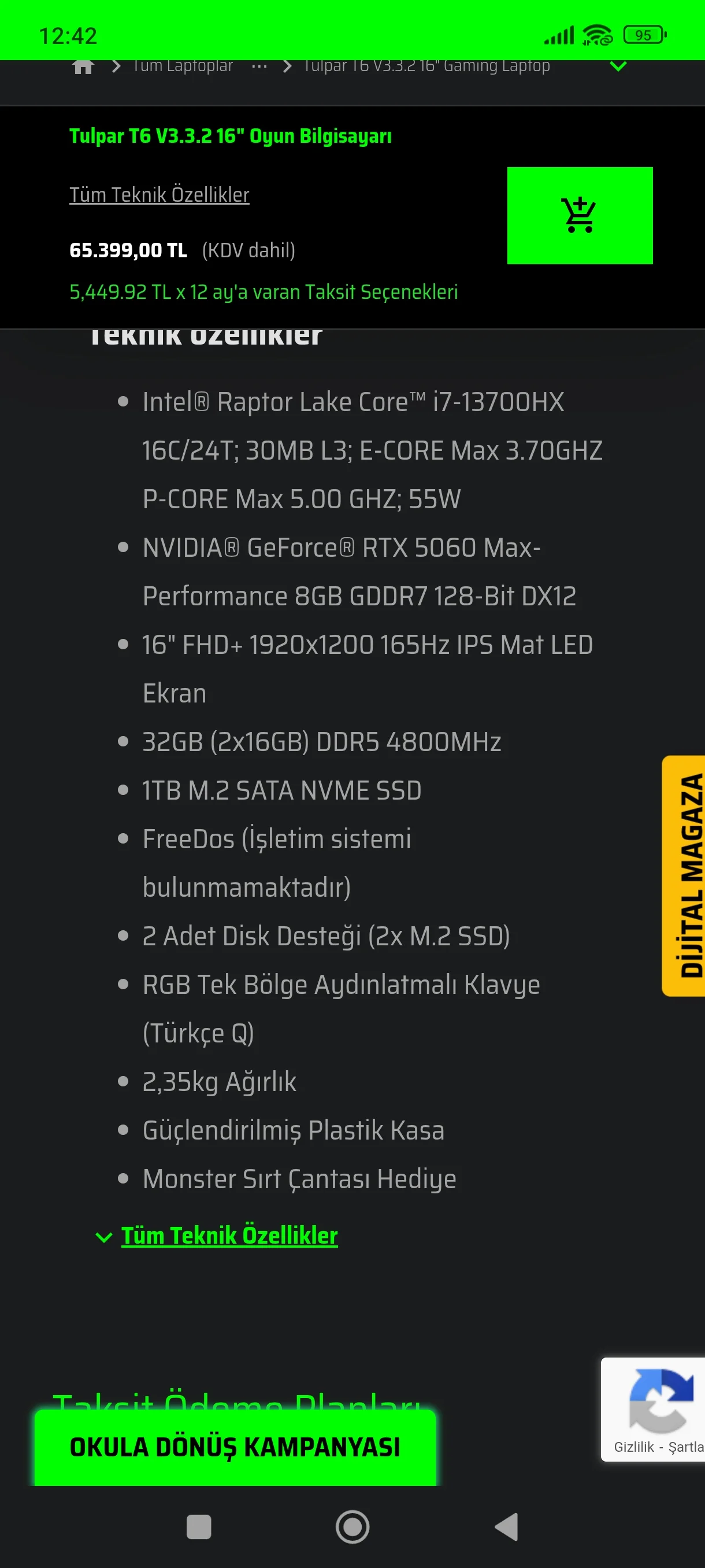 Bütçe 60.000TL'den yukarı çıkıyorsa bunu al https://www.hepsiburada.com/game-garaj-slayer-x7t-5070-c2-intel-core-i7-14650hx-32gb-ram-1tb-ssd-rtx5070-16-qhd-180hz-ips-freedos-oyuncu-laptop-pm-HBC00009MMCJQ Onun haricinde dün açtığın konuda maksimum 60 dediğin için bu monsterı önermiştim. Tulpar T6 V3.3 16" Oyun Bilgisayarı Tulpar T6 V3.3 16" laptop oyun bilgisayarı, Intel Core i7-13700HX işlemcisi ve 8GB RTX 5060 ekran kartıyla her koşulda maksimum performans vadediyor! www.monsternotebook.com.tr