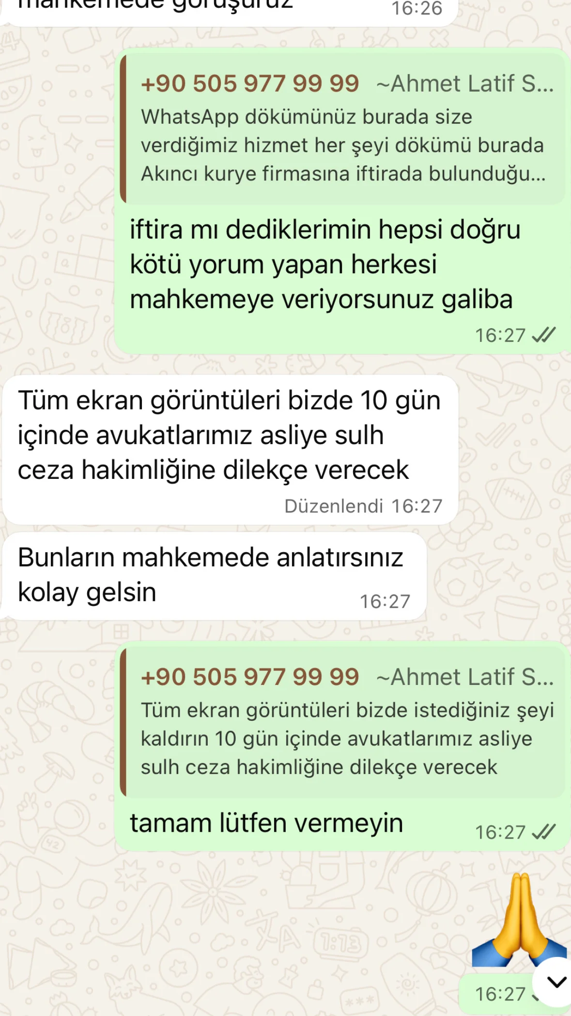 selam aleyküm dostlar bundan 3 hafta önce telefon alıcaktım fakat istanbul dışında köydeydim ve alıcağım kişiyle anlaştık bende googledan bi kurye firması buldum ve çağırdım gidip cihazın sahibinden aldı bana fotoğraf video attı fakat wp mesajlarında sürekli aceleci ve üslup olarak kötü konuşuyordu sanki müşteriyle değil arkadaşıyla konuşuyor gibi ilk olarak telefonun sahibi şişli cevahir avmdeydi zaten onunla iletişmdelerdi konum attı sonrasında kurye teslim aldı bende kargo ile gönderin dedim kurye firmasına onlarda ısrarla otobüsle gönder daha hızlı az masraflı dediler bende karar değiştim esenler otogarına gönderdim sonrasında kayboluyor yorumlarını çokça görünce fikrim değişti hemen kurye firmasını aradım fakat kurye teslim ettiğini kargoya verirlerse 600₺ daha ekleneceği söylendi cevahirde esenler otogarına 600 aldılar ordan bahçelievler yurt içi kargoya aynı fiyat verdiler fakat bende dedim çok yakın konum yardımcı olamaz mısınız olmadılar 100 metre bile olsa 600 sabit fiyat olduğunu söylediler bende kabul ettim otobüsle gönderme riskini alamadım 3 hafta önce googledan işletmeye yorum yapmıstım bugün wpdan yazmışlar sizi mahkemeye vericeğiz yalan ve iftira atmışım 1 kilometre yolla 600 istemisiz gibisinden ama ben o gün baktığımda esenler otogarı bahçelievler çok yakın km di suanda 9 km olarak gözüküyor ama yakın bi kargo firmasına verebilirdi onu geçtim benim soru sormam suç mu yalan ve iftira deniliyor neye göre diyorlar istediği yere versinler zaten wp konuşmalarından hakaret hiçbirşey yok zaten sohbeti silmişim sadece dediğin 1 km yola 600 mi istiyorsunuz bu da soru olarak sordum mesajlarıda bırakıyorum lütfen düşüncelerinizi söyleyin yorumumuda uğraşmamak için silicem eğer beni verirlerse bende onları veririm