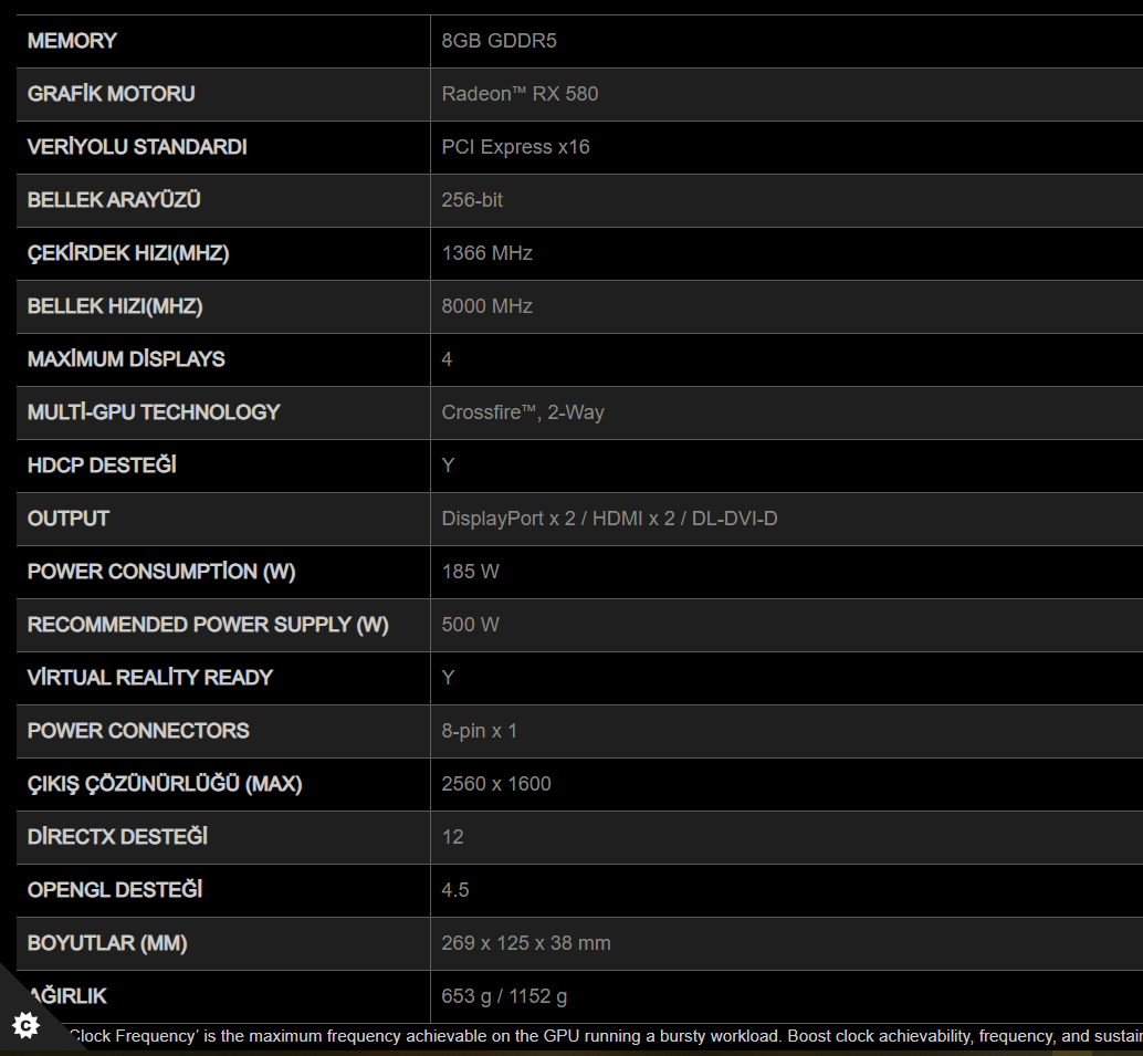 8gb belleğe sahip olan Armor 580 veri yolu PCI Express x16 olup bellek arayüzü 256-bit. Çekirdek hızı 1366mhz olup bellek hızı 8000mhz. Direct-x 12 destekleyip boyutu 269 x 125 x 38 mm Ağırlığı ise 653 g / 1152 g. Teknik verileri bunlar.
