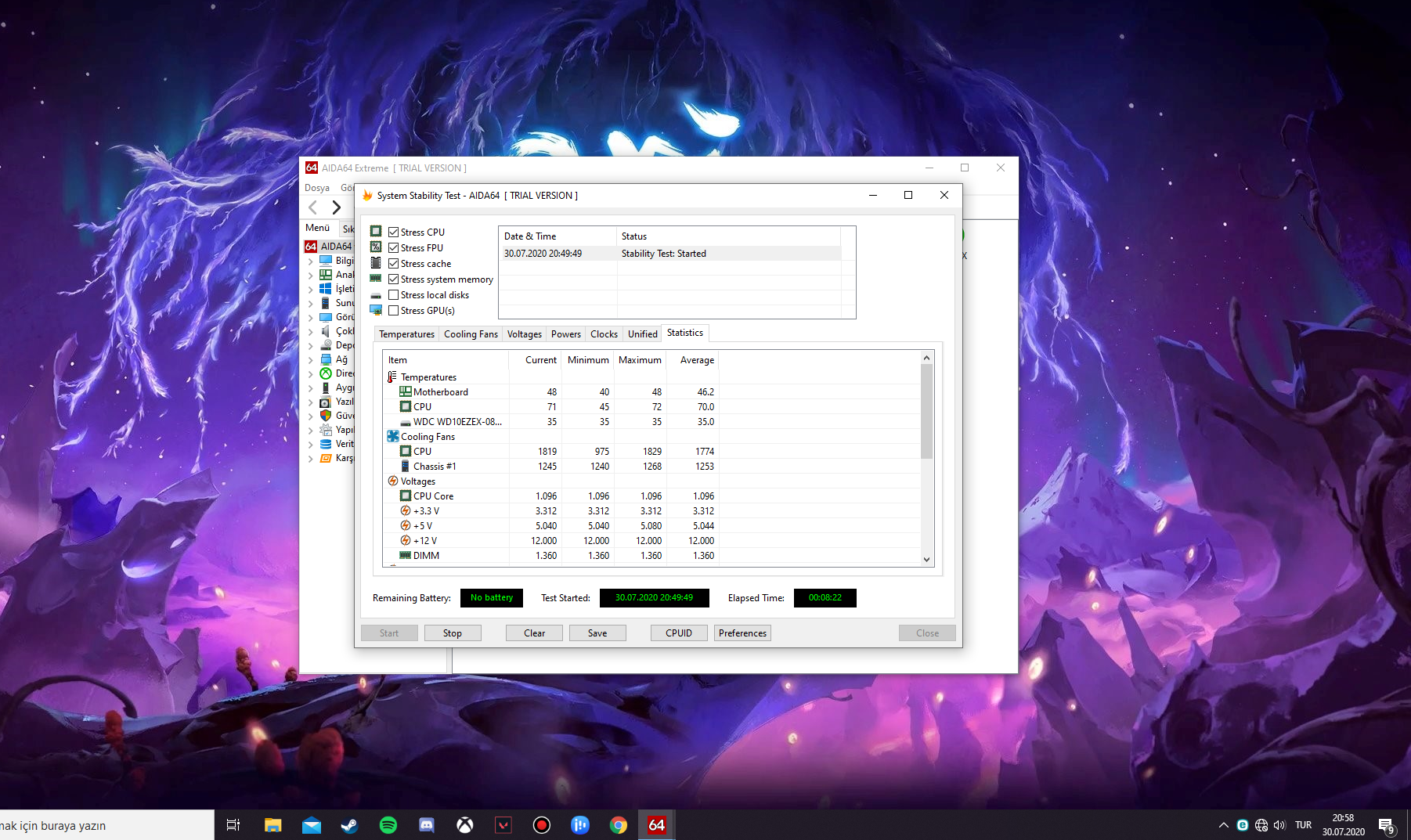 Test olarak AİDA64 testini yaptım ve sıcaklıklar boşta 45-46 derece, tam yükte yani %100 yükte ise 71-72 derece idi. Oyunlarda merak edeniniz olursa pubgde en fazla 57-58 gördüm valorantta ise 55-56. Şöyle bırakıyım testleri: