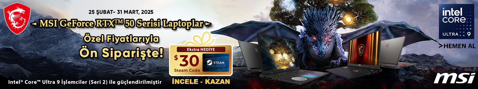 Ön siparişe özel olarak MSI GeForce RTX 50 Serisi Notebooklardan birini satın alıp uygun platformlardan birinde ürün deneyimini paylaşanlar $30 Steam Cüzdan Kodu kazanıyor!