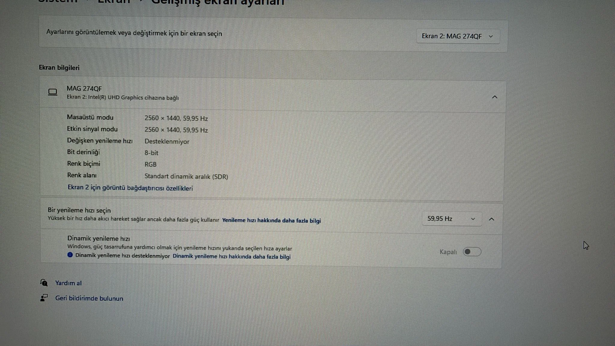 Arkadaşlar merhaba, 2 gün önce MIS 27" MAG 274QF model monitör aldım. Monitör 2K ayarlarda 180hz destekliyor. Dün monitör geldiğinde test için monster dizüstü bilgisayarıma bağladım. Fakat 1920x1080 ayarlarda maksimum 120 hz ayarlanıyor. 2K çözünürlüğe aldığımda ise 60hz üzerine çıkmıyor. Monitörü HDMI kablosu ile bağladım. Moniötürün kendi ayarlarından kare hızı ayarlanmıyor. Bilgisayar üzerinden ayarlamaya çalıştığımda ise "Değişken Yenileme Hızı" desteklenmiyor yazıyor. Yeni kasa topladım bu monitörü kullanacağım fakat o henüz gelmedi. Geldiğinde Display port kablosu ile bağlayacağım. Normalde 1080'de 180hz vermesi gerekiyor fakat vermiyor. MSI Display kit indirip kurdum fakat orada da 1080'de maksimum 120 seçeneği var. Ne yapmalıyım?