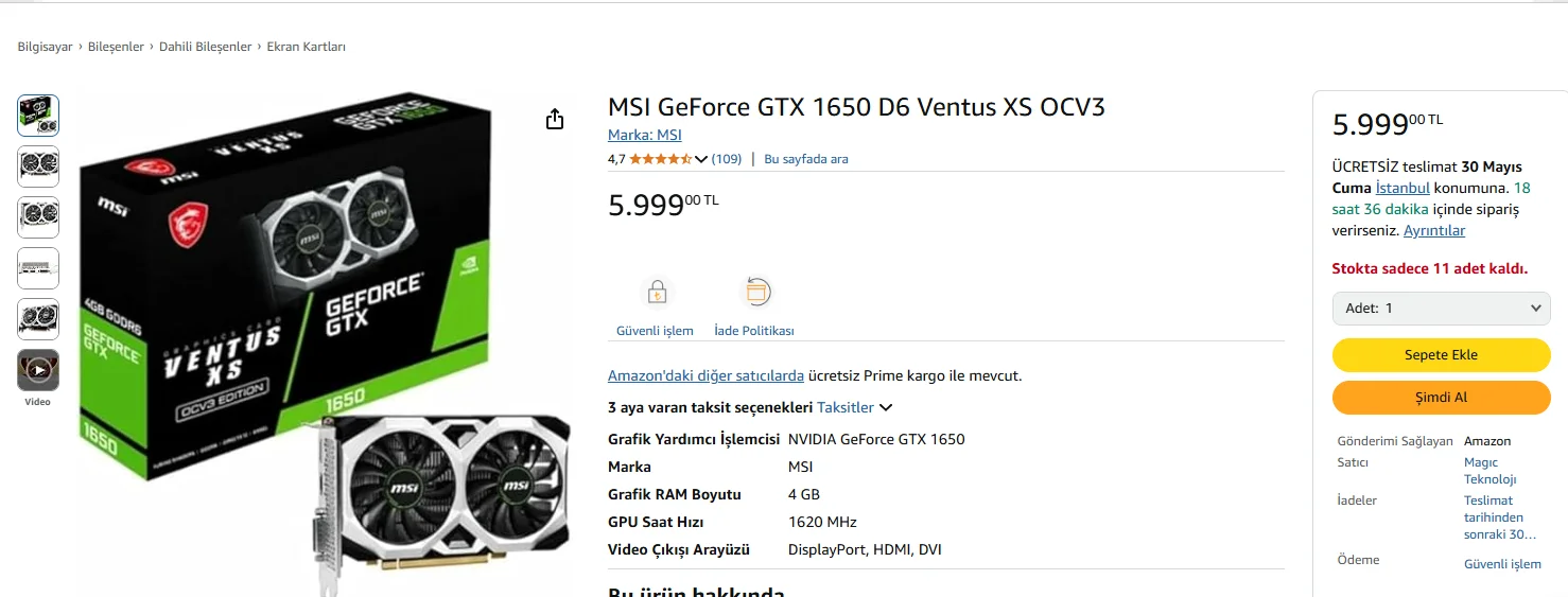 MSI VGA GEFORCE GTX 1650 D6 VENTUS XS OCV3 4GB GDDR6 128B DX12 PCIE 3.0 X16 (1xDVI 1XHDMI 1XDP) - Alınır mı ?