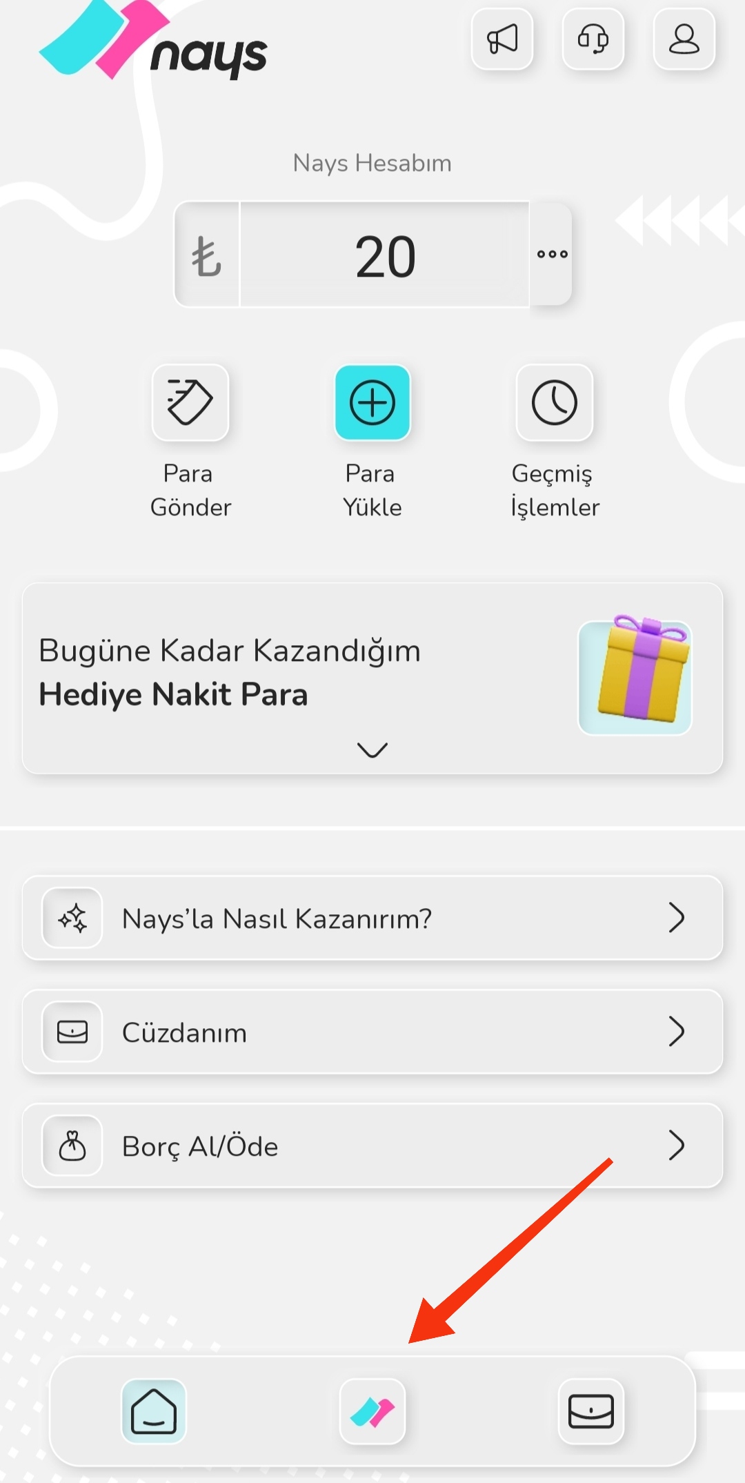 Nays> ortadaki tuş> para çek> devam et> çekmek istediğin tutar (20'nin katı olmak zorunda diye biliyorum)> kamera açılacak> Bankamatikte ki QR kodu okut ve para çekme işlemin başlasın.
