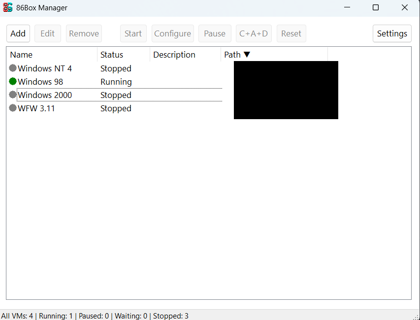 86Box ile 8088 ile Pentium 2 arasındaki işlemcileri emulate eden bir yazılımdır. Gerçek bilgisayar özellikleri (BIOS, Sürücüler) vardır. OpenGL 3.0 Core ile CRT Modu bile var. 86Box Manager ile birden fazla makine yapabilirsiniz. Video kartları, İnternet kartları ve birçok gerçek bilgisayar özelliklerini barındırıyor. VMware veya VirtualBox gibi Hyper Virtualization değil, emulator kendisi. O yüzden biraz ağır bir uygulama. Ben bile Pentium 2 işlemcisini seçtiğimde ses takılıyor (Bilgisayar güçsüz kalıyor) Pentium MMX ile veya AMD işlemcileri ile rahatça 1x, 2x, 3x ,9x, NT 3x, NT 4 işletim sistemlerini açabilirsiniz. 2000 ve XP biraz hantal çalışıyor fakat AMD K6-2 133 Mhz işlemci ile normal bir 2000 deneyimi sunuyor.