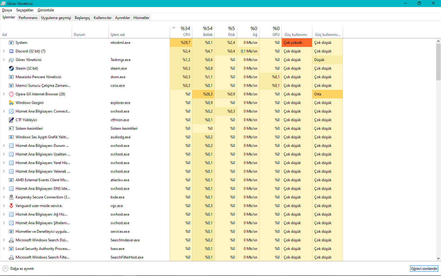 Merhaba. Dün bilgisayar fanının çok hızlı döndüğünü farkettim ve görev yöneticisine girip duruma baktım. Önceden de bakıyordum ama SYSTEM adlı bir görev %30 civarı CPU kullanıyordu. O sırada discordta kanaldaydım. Kanaldan çıkınca system adlı görevin %2 kullanıma düştüğünü farkettim. Sorunun discordun ayarlarıyla olduğunu düşünerek ayarlara girdim. Ses ve görüntüye girince SYSTEM birden artıyordu.