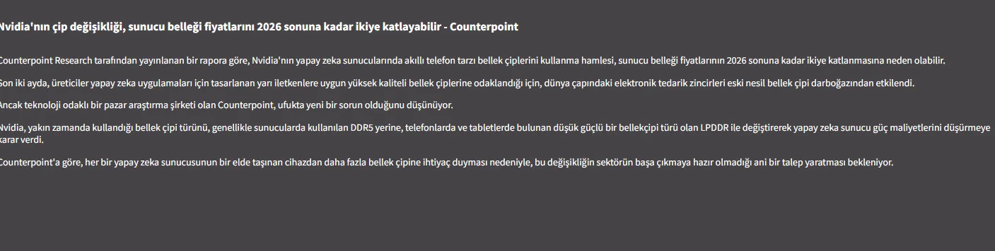 Özet: Nvidia, yapay zeka sunucularında güç tüketimini azaltmak amacıyla DDR5 yerine akıllı telefonlarda kullanılan düşük güç tüketimli LPDDR belleğe geçiş yapıyor.