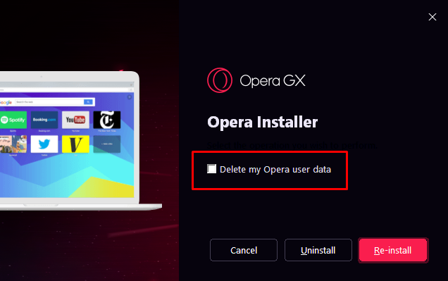 Windows Tuşu + R kombinasyonuyla çalıştır'ı açın, açtıktan sonra "%LOCALAPPDATA%\Programs\Opera GX\launcher.exe" -uninstall yazın (Tırnak işaretlerini silmeden)