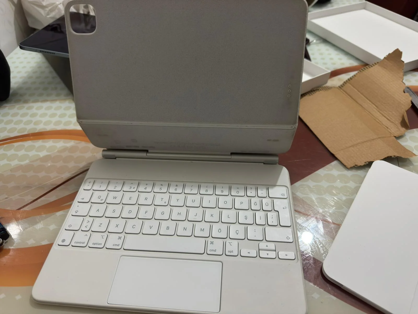Geçeyim kendi yorumlarıma. Klavyeyi zaten kendi tabletimde kullanmak için almıştım. Kutusuyla birlikte geldi. Kutunun içinden sadece klavye ve okumadığımız o kağıtlar çıktı. Ben kendi tabletim için beyaz olan 11 inç modelini almıştım. Ürün beyaz olduğu için bir hayli kirlenmiş ama kullanılmayacak derecede değil. Çok dikkatli kullanmıyorsanız zaten siz bu ürünü sıfır da almış olsanız uzun vadede beyaz olduğu için bu hale gelir. Tuşlarını, touchpadini test ettim hiçbirinde bir sıkıntı yok. Menteşeleri bile hala çok sert muhtemelen ürün olduğu gibi duruyordu çok az açılıp kapandı. Şimdi klavyeyi elimden geldiğince güzel bir temizleyeceğim ondan sonra kullanmaya devam edeceğim. Benim için kozmetik önemli değil bence 2000 liraya oldukça değen bir alışveriş oldu. Konuyu açan arkadaşa teşekkürlerimi iletiyorum. Direkt bana geldiği şekil resimlerini de aşağıya ekliyorum. Temizlik umduğumdan daha başarılı olursa onları da eklerim.Üzme bizi