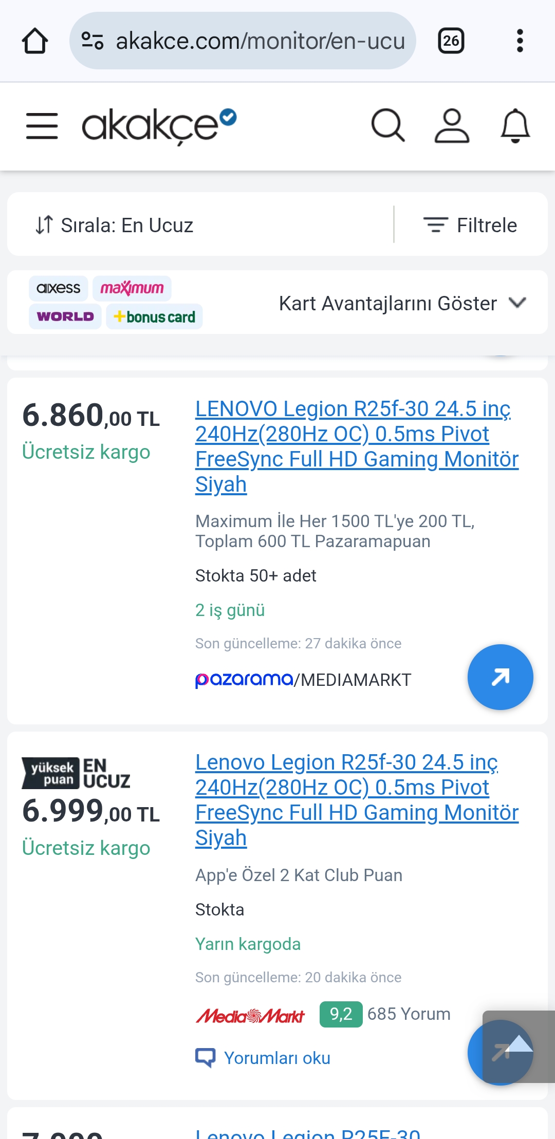 Lenovo Legion 24.5" 240Hz 0.5ms (1. bulduğum)
