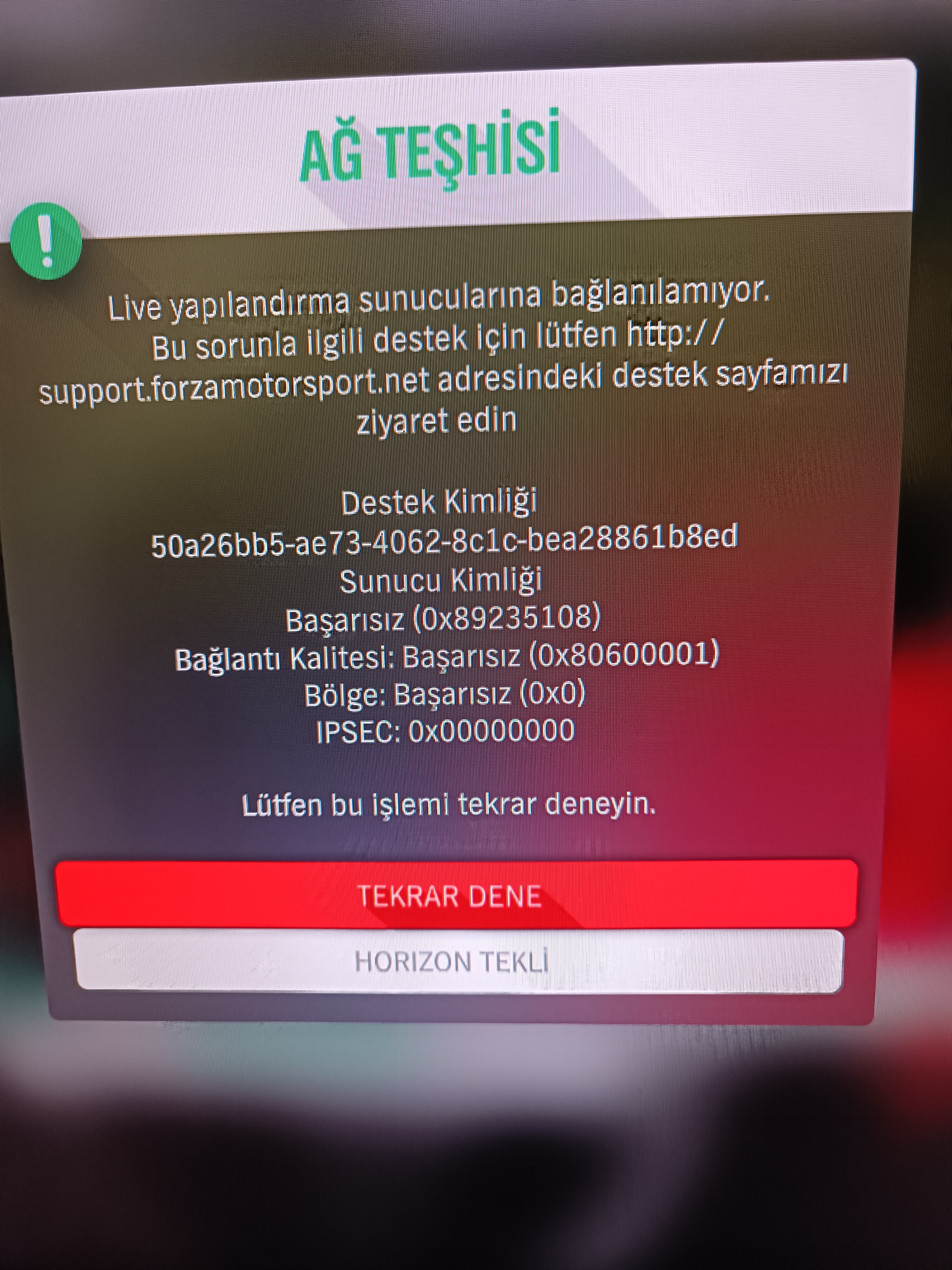 Merhaba daha önce asetto Corsa da online sunuculara giremiyordum, oyunu silmiştim bu sebeple. Şimdi ise forzaya online giremiyorum bu hatayı veriyor.