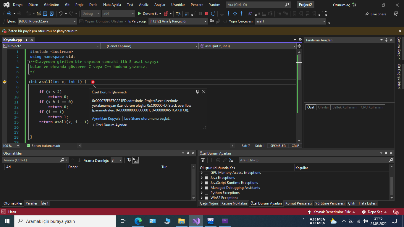 Merhaba arkadaşlar, visual studio da girilen sayıdan sonraki 5 asal sayıyı yazdırmak için özyinelemeli kod yazıyordum ama ekteki hatayı aldım. Yardımlarınızı bekliyorum .