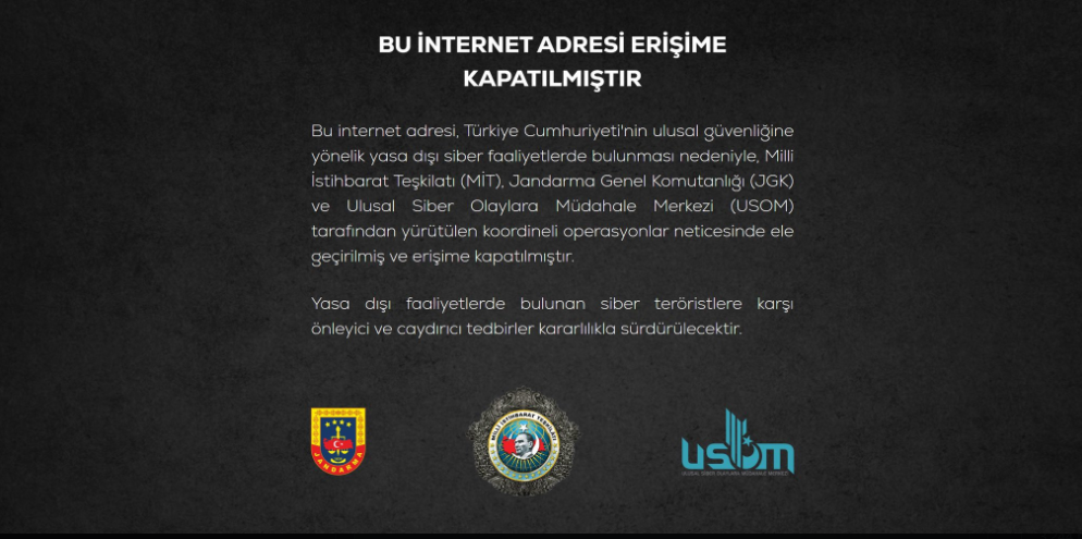 Bu internet adresi, Türkiye Cumhuriyeti'nin ulusal güvenliğine yönelik yasa dışı siber faaliyetlerde bulunması nedeniyle, Milli İstihbarat Teşkilatı (MIT), Jandarma Genel Komutanlığı (JGK) ve Ulusal Siber Olaylara Müdahale Merkezi (USOM) tarafından yürütülen koordineli operasyonlar neticesinde ele geçirilmiş ve erişime kapatılmıştır.