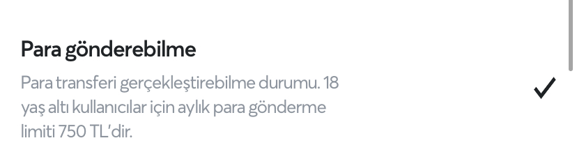750 tl ?Şu ana kadar kayda değer gördüğüm tek bir sıkıntısı var, o da 18 yaşının altındakilere aylık sadece 750 ₺ para transferi hakkı. Epey bir saçma bir özellik ama bunun haricinde kusurunu görmedim.
