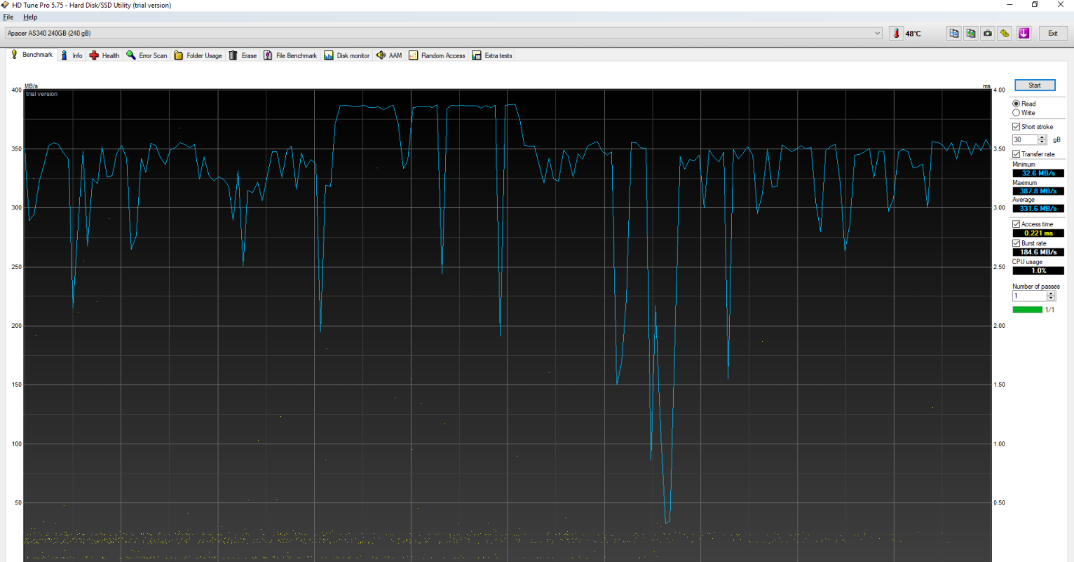 Arada kalınan rakibi Apacer AS340 ile karşılaştırmak için @Alper140'den değerlerini istedim. Crystal Disk Mark üzerinden 240 GB modelde 500 MB/s civarında hızlar alıyordu fakat HD Tune'de sonuçları dalgalı çıktı.