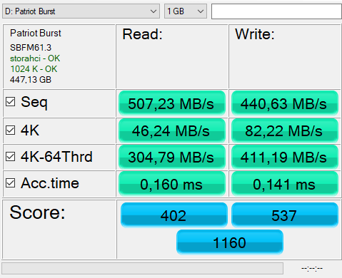 Çok inişli çıkışlı, ortalama hızları ise Patriot ile aynı sayılır fakat minimum değerler düşük ve maksimum değerler o kadar yüksek değil. Bu da Patriot'un 120 GB modelinin bile Crystal Disk Mark'ta anlık hızı düşük olsa da daha stabil bir aktarım yaptığını kanıtlıyor. 480 GB modellerinde zaten bu hızlar 500 MB/s civarında oluyor, çok daha stabil ve hızlı.