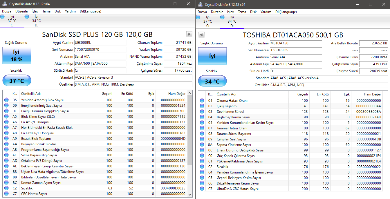 SSD'de 20 GB boş yer var birde ssd çok mu kötü olmuş yani yakın zamanda bozulabilir mi %18 çok az değil m bir sorun oluşturur mu?Anladım SSD zaten sorunlu diye biliyorum. Sağlık durumu da %18'e düşmüş. Ancak bir hata yok gibi, aşağıları görmedim ama. 17K o SSD için gayet iyi
