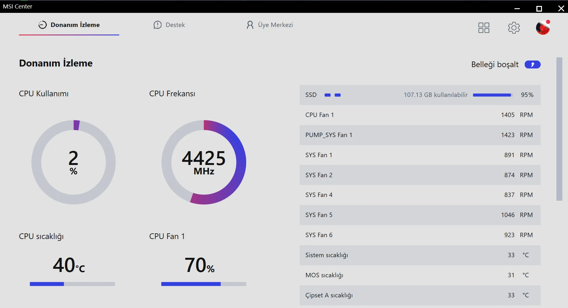 MSI Center'dan gösterebilir misiniz fan değerlerini bunun gibi.