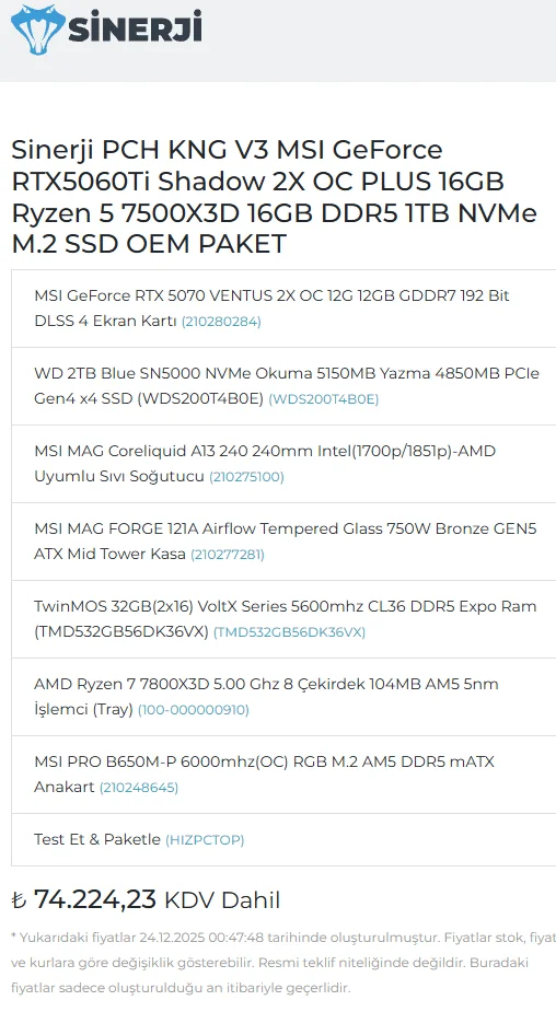 Sinerji PCH KNG V3 MSI GeForce RTX5060Ti Shadow 2X OC PLUS 16GB Ryzen 5 7500X3D 16GB DDR5 1TB NVMe M.2 SSD OEM PAKET fiyatı ve teknik özellikleri için hemen Sinerji Bilgisayar'a gelin ve en iyi fiyatlar ile sahip olun