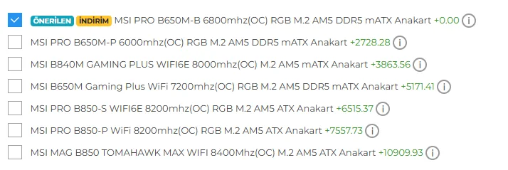 İstediğim şekilde sistemi alabildim sadece anakart ve işlemciyi değiştirmedim,birazdan firmayı arıcam stoklarda var gözüküyor eğer kabul ederlerse fiyat farkını ödeyip "MSI B840M GAMING PLUS WIFI6E 8000mhz(OC) M.2 AM5 mATX Anakart +3863.56" ile değiştirmeyi düşünüyorum. İlerleyen süreçtede 7800X3D ile güncelleme yaparım sisteme.