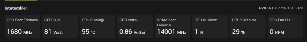 alt+z'den istatistiklere girip oradan seçmen lazım güç tüketimi ve dereceyiEski ekran kartım amdydi oradan alışmışım alt r yapınca derece yazmıyor kurcalarım bi ara