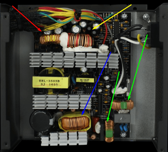 Sarı ile işaretli olan 12V ve 5V, kırmızı ile işaretli olan 3.3V kanalı, mavi ile işaretli olan filtremele, yeşil ile işaretli olanlar da filtreleme için kullanılır. Bu bir grup düzenleme örneği.