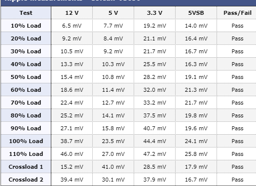 1-Ripple(dalgalanma) değeri: İntel'in belirlediği standartlar 120 mV altıdır fakat iyi bir PSU'da 40-45 mV altı olmalı. Referans olarak %100 yükü veya çapraz yük testlerini referans alabilirsiniz. Tabii PSU'yu alan kişi genelde %100 yükte kullanmaz. VS 2017(VS 2018 olarak geçiyor) ripple tablosu: