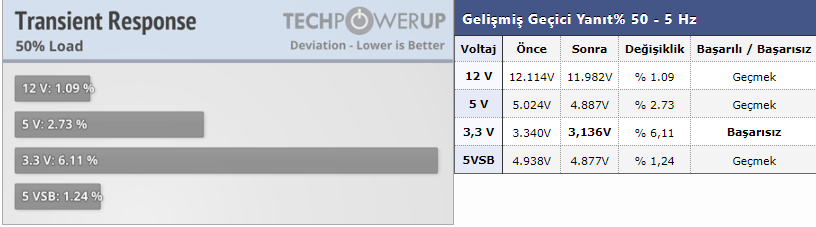 4-Geçici tepki testleri: Bu testte güç kaynağına anlık bir yük sağlanır. Voltajların ne kadar düştüğü gözlemlenir. Eğer %6 ve üstü değişiklik olursa PSU o testte başarısız sayılır. Her kanal farklı tepki verir. Daha iyi anlamanız için bir örnek vereceğim(PSU VS 2018 gri etiket):