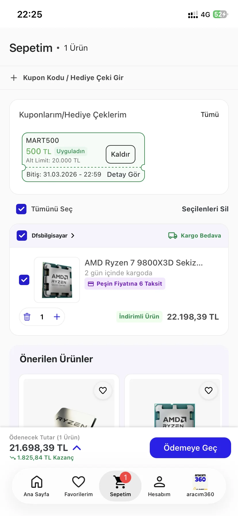 bekle en kötü 2hafta içinde gaming gecesinde gelirArkadaşlar ptt avm den daha önce alışveriş yapmadım 9800x3d işlemci alıcam en uygun burda kuponla beraber 21698 tl yapıyor satıcı dfs bilgisayar ptt avm de bi sıkıntı yaşarmıyım