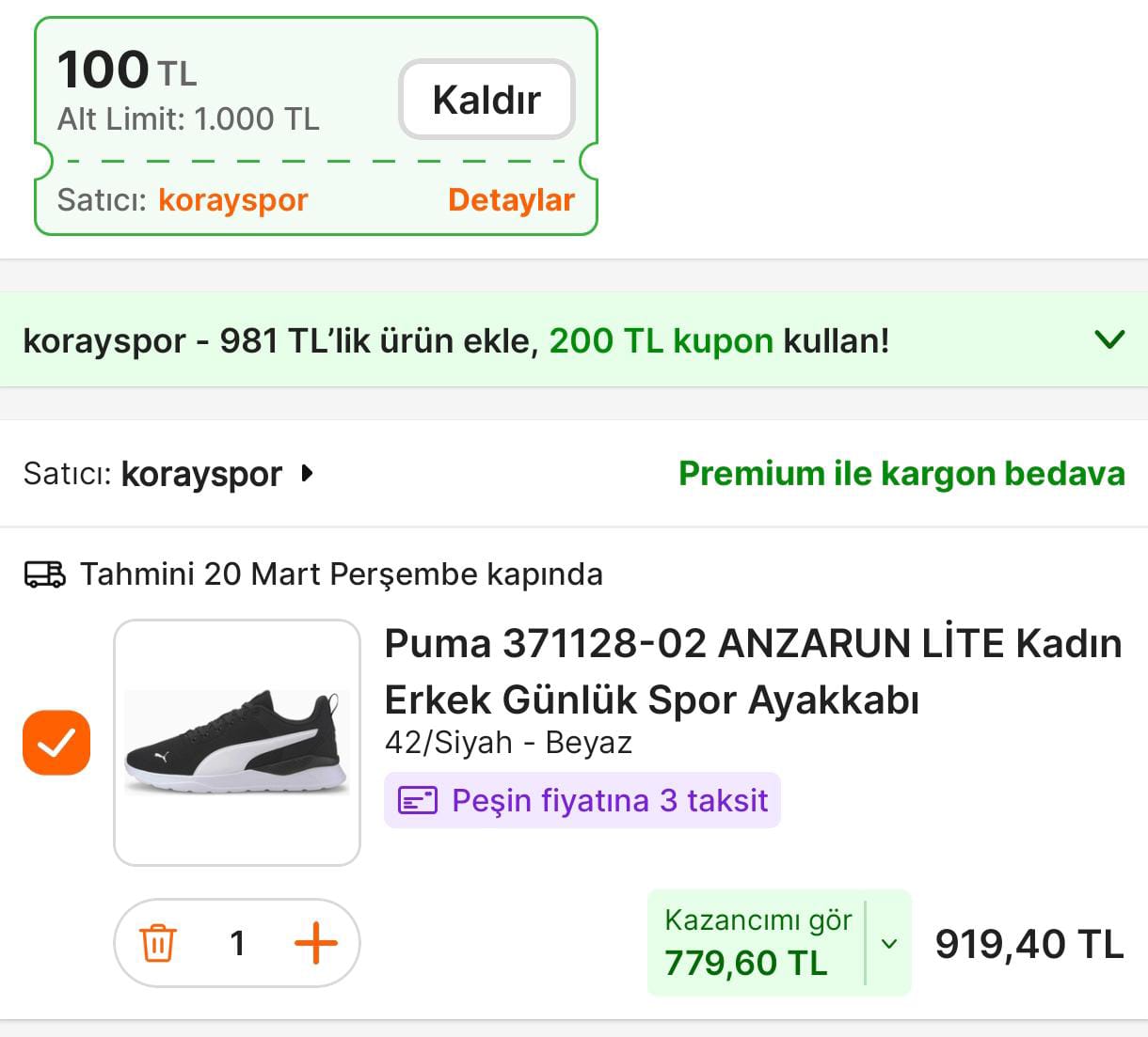 Puma ayakkabı altındaki kuponla 919 TL. Beden çeşitli ama çabuk tükenir ihtiyacı olan kaçırmasın. Ben geçen sene daha pahalıya almıştım bunu 🫨