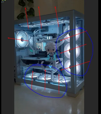 Doğru fan akışı böyle olmalı.Ekj olarak fanların rpmlerini 1400ü geçmeyecek şekilde ayarlayabilirsiniz bu zarar vermekle alakası yok tamamenfazla ses yapmaması için