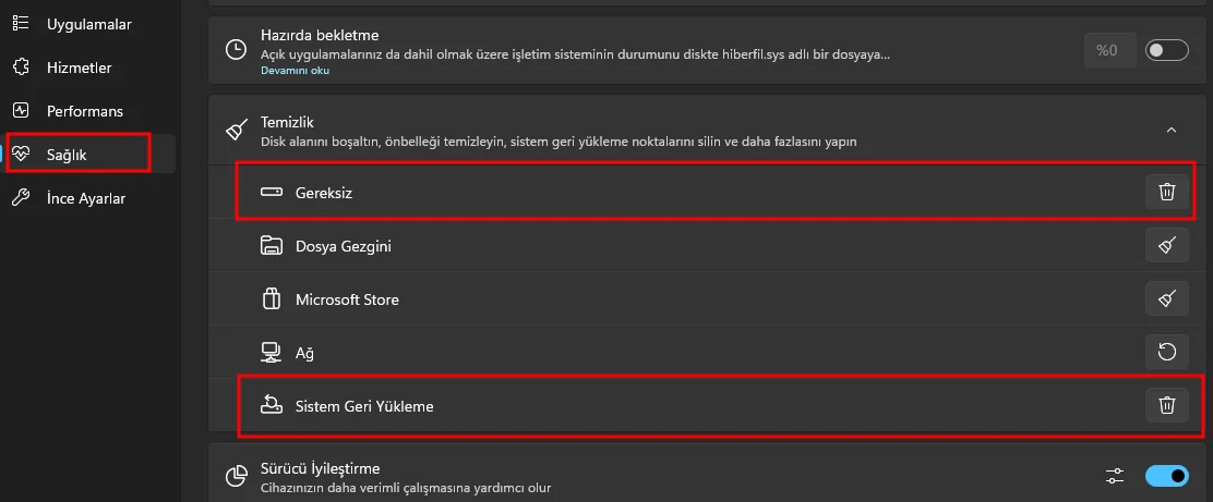 Gereksiz uygulama vb. kaldırarak depolamada alan açın. Eğer çok doluysa geçici dosyaları yükleyip, silerken sistemi bir tık yavaşlatabilir. Yani en azından disk rengi kırmızıda olmasın. Temizliği ayrıca Wintoys üzerinden de geçici dosyalar ve sistem geri yüklemeleri silerek de yapabilirsin.