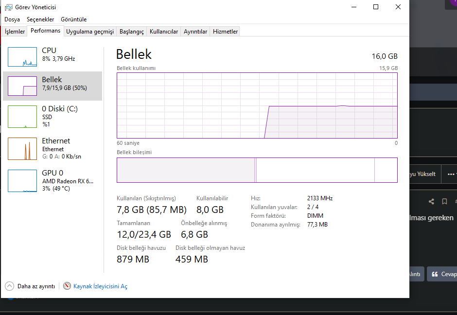 sistemindeki işlemci ne ve görev yönetici/ram ekran görüntüsü atar mısın