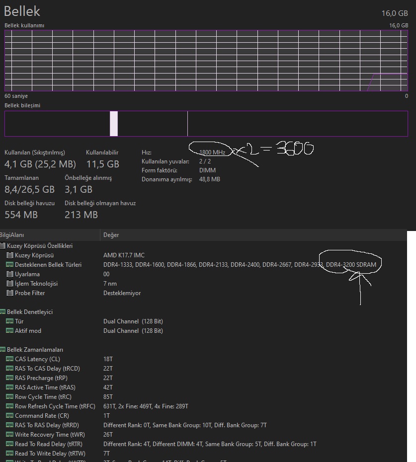 Elimdeki ramler 8x2 3600mhz cl18 gskill ram anakart a takım xmp i açtım otomatik olarak 3600 mhz e çekti ancak anakartım max 3200 mhz destekliyor diye biliyorum şuan ramlerim 3600mhz mi çalışıyor yoksa öyle mi gözüküyor ekte fotoğraf koydum. cpu-z de de 1799mhz yazıyor 2 ile çarpınca 3600 e denk geliyor yine