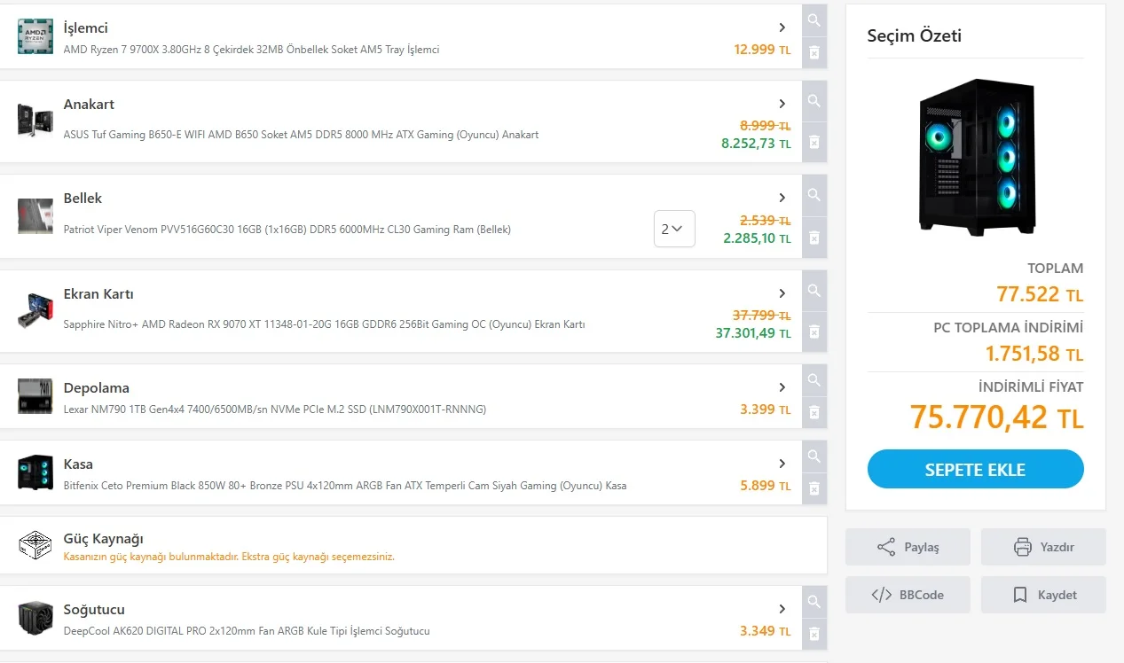 Selamlar pc toplamak istiyorum bi sitede varolan kredi kartıma 3 taksit seçeneği var buradan toplamak istiyorum. Resimdeki pc de şunu şununla değiştrsen dediğiniz parçaları söyler misiniz ? Hayırlı forumlar.