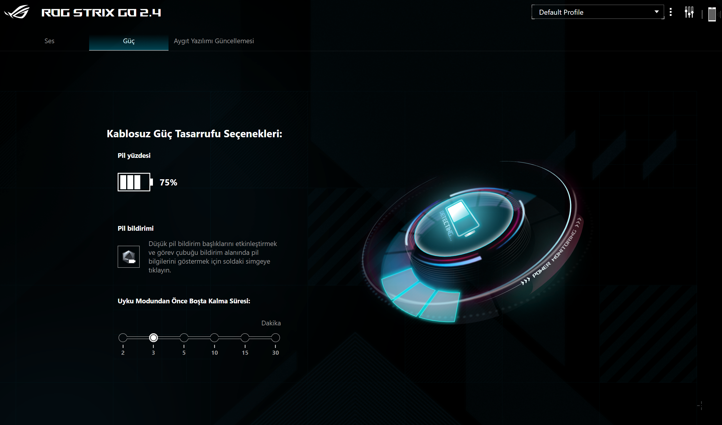 Yazılım kontrolü için Armoury Crate'i indirmeniz lazım. Buradan kulaklıkla ilgili çeşitli ayarları yapabilirsiniz. Ben bu kulaklığı alan herkesin bunu indirmesini öneririm. Yazılımdan ses profili, ekolayzer ayarı, 7.1 gibi özellikleri kontrol edebiliyorsunuz. Ayrıca uyku modu ayarı yapılabiliyor ve pil durumu da görüntülenebiliyor. Yapay zeka mikrofon gürültü engelleme özelliği de bulunuyor. Yazılımda ayrıca birkaç tane daha denemediğim mikrofon iyileştirme seçenekleri mevcut. Üründe ANC (aktif gürültü engelleme) veya ortam sesi özellikleri mevcut değil, bu fiyat aralığında da zaten olması pek beklenmemeli. Ancak kulaklığın pedleri ses izolasyonunda iyi bir iş çıkarıyor.