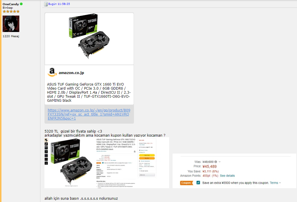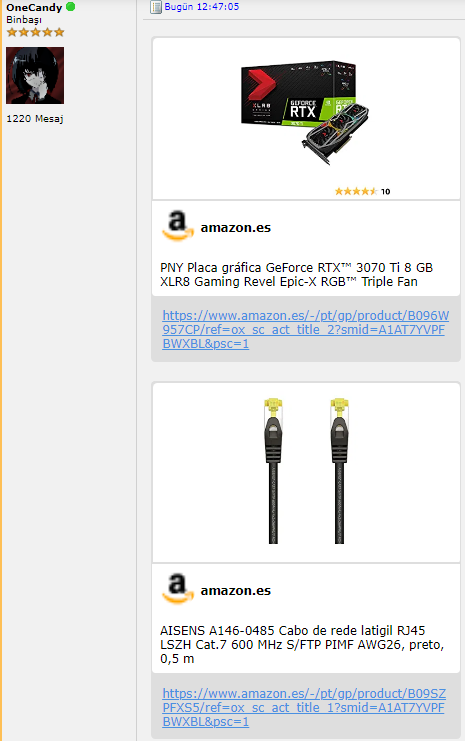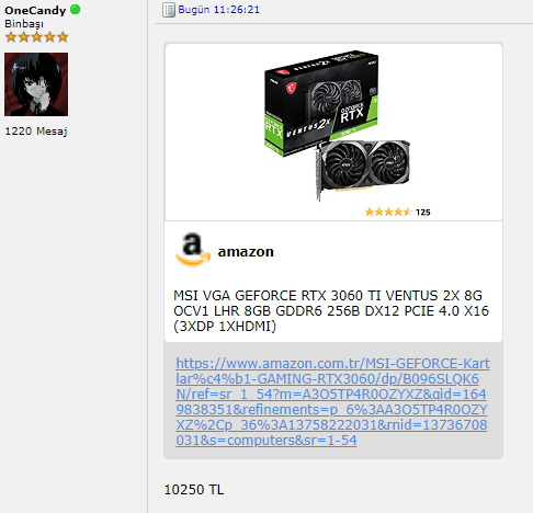 Onecandy sen misin ya. Görüyorum seni sık sık. Geçenlerde 1.5 ay önce falan 3060 yerine 3050 yollanmıştı millete. Sen 5 euro kupon almıştın çocukla tartışmıştınız falan komiktiBENZETMİŞİNDİR KNK.