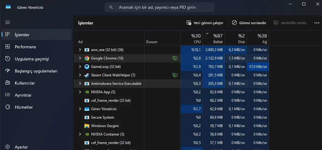 PUBG Mobile emülatorden oynuyorum fakat daha girdikten 5dk sonra bile oyun böyle hata veriyor, sonra oyun 3 FPS'lere kadar düşüp komple bilgisayar kilitleniyor kapanıyor. RAM 16 GB ama yeterli diye düşünüyorum, görev yöneticisinde aow.exe adında bir şey çok tüketiyor. Çözüm bilen var mı? Oyunun ayarlarından mı değiştireceğiz? Oynatmıyor oyunu bu hata.