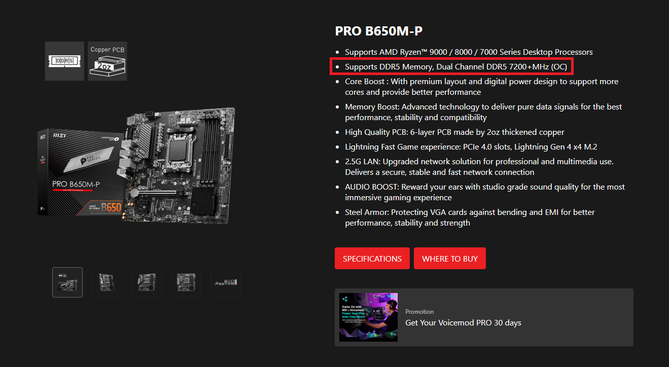 https://www.epey.com/anakart/msi-pro-b650m-p.html 6000mhze kadar destekliyor. termal macun içinden çıkar diye biliyorum ama emin değilim