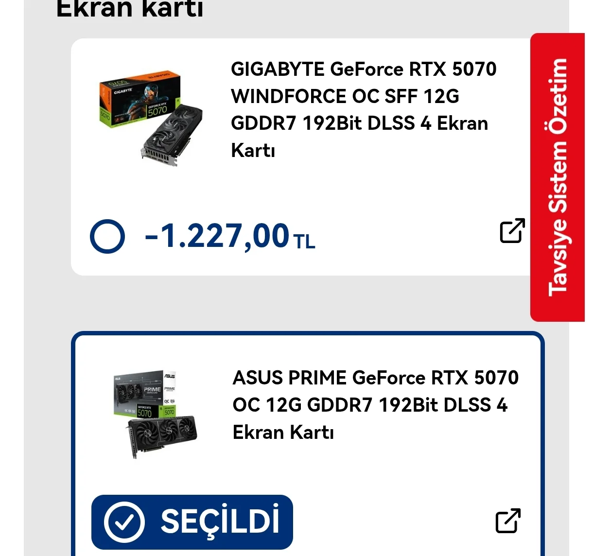 asus prime al gigabyte kartların termal macunu ya da ped akma sorunu vardı. hemde asusun 3 yıl garantisi var. kendim kullanıyorum asusu sıcaklıklar oyunlarda 65 i geçmiyor üstelik akvaryum kasa kullanıyorumRtx 5070 gigabyte mi asusmu