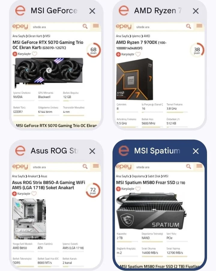 32-33k civarına 9070xt var eğer 5070 tercih etmek istiyorsanız F/P 2 fanlı modellere bakın hocam , ssd bir tık abartı samsung 990 pro yeterli olacaktır , ana kartıda orta seviye b850 alıp işlemciyi 7800x3d alabilirsiniz.Bu 4 parçayı almayı düşünüyorum birbirleri ile uyumlu olur mu darboğaz vs bu konularda fazla bir bilgim yok.